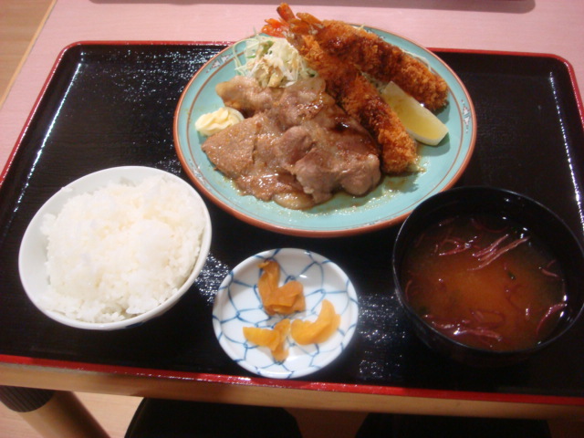 生姜焼き定食+エビフライ。これで850円