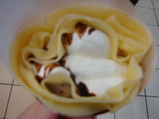 旅行2日目に美味そうな匂いに釣られたのですがハンバーガー食ったばかりだったので、次の日頂きました!値段600円前後とは思えないボリューム感でした。クレープは「生クリーム」と「チョコソース」のシンプルなモノ。甘々ぁ~!!CookieやCHOCOLATEは飽き気味でもコレは◎