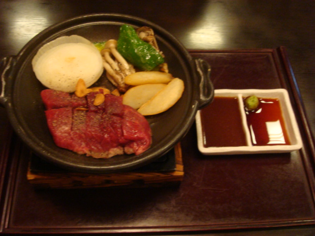 右:映画視聴後、和食の店にてサイコロステーキを注文。