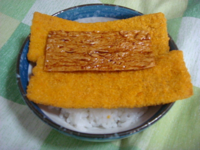 左の画像は→そぅです。駄菓子屋などで売ってる「ソースカツ」がご飯のおかずになるんじゃ?って事を聞きマジにやってみた。